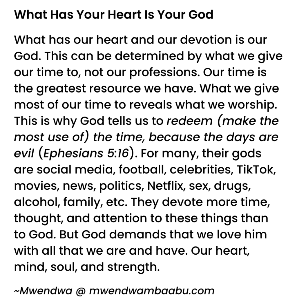What has our heart and our devotion is our God. This can be determined by what we give our time to, not our professions. Our time is the greatest resource we have. What we give most of our time to reveals what we worship. This is why God tells us to redeem (make the most use of) the time, because the days are evil (Ephesians 5:16).