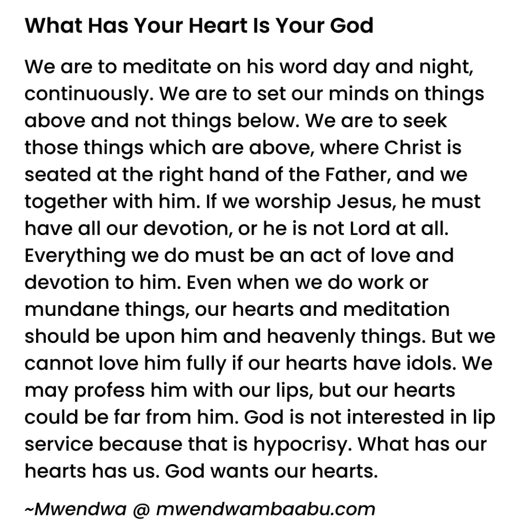 Even when we do work or mundane things, our hearts and meditation should be upon him and heavenly things. But we cannot love him fully if our hearts have idols. We may profess him with our lips, but our hearts could be far from him. God is not interested in lip service because that is hypocrisy. What has our hearts has us. God wants our hearts.